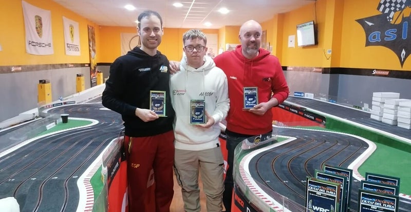 A una distancia mayor se encontraban 3 pilotos luchando por el tercer cajón del podium, Jose Daniel Hernández desde Andalucía pero viviendo en Asturias, Raúl Martín desde Alicante y Rubén Paz desde Rias Baixas Slot en Galicia. El gato al agua se lo llevó el Andaluz por una distancia menor a 3 segundos sobre Raúl Martín y a no más de dos segundos de este, Rubén Paz. No más de 5 segundos separaron a estos 3 pilotos. Estamos seguros de que viviremos grandes luchas en esta categoría en cuanto vayamos cogiendo ritmo y continuidad!